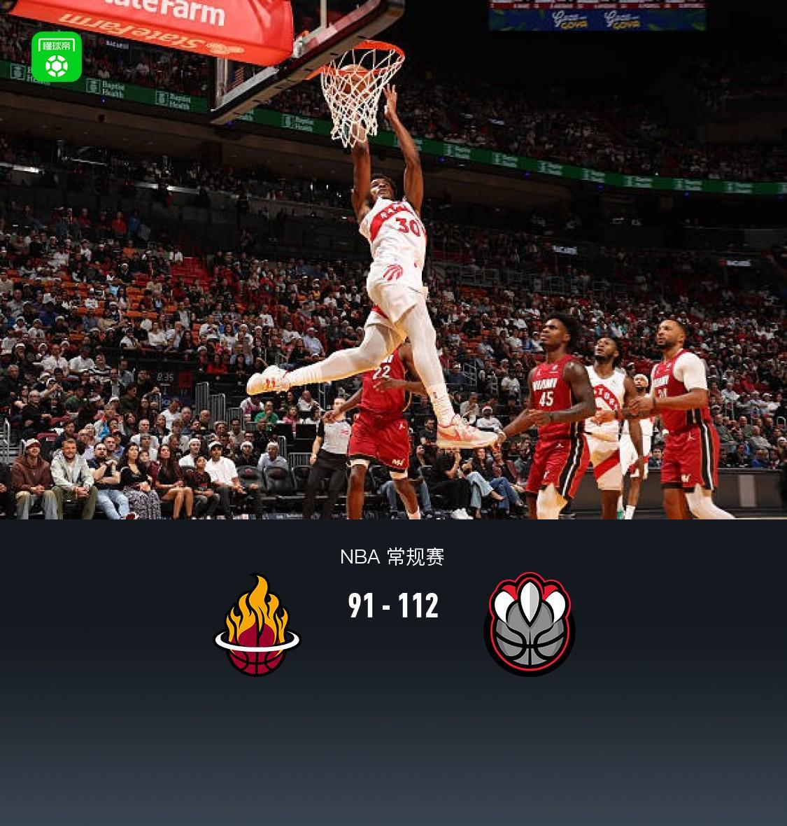 北京時間12月24日NBA 常規(guī)賽,邁阿密熱火對陣多倫多猛龍。半場熱火44-51猛龍,最終熱火91-112猛龍。