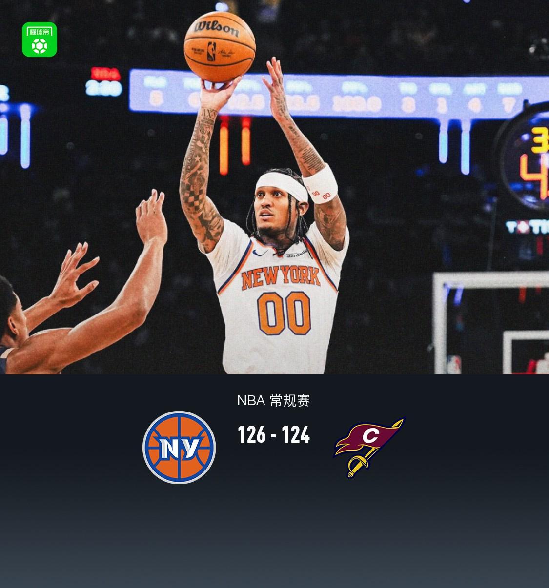 第四節(jié)尼克斯布倫森拿下13分,騎士米切爾拿下15分,最終尼克斯126-124戰(zhàn)勝騎士