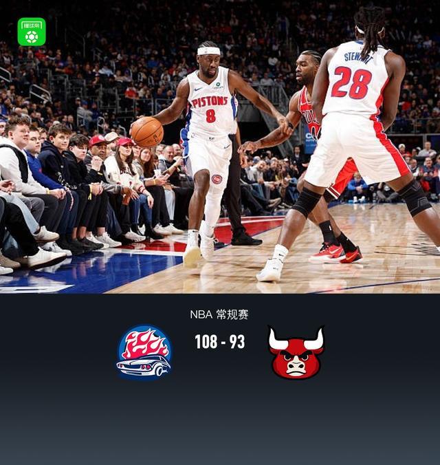 第四節(jié)活塞查茲-拉尼爾拿下8分,公牛武切維奇拿下5分,最終活塞108-93戰(zhàn)勝公牛