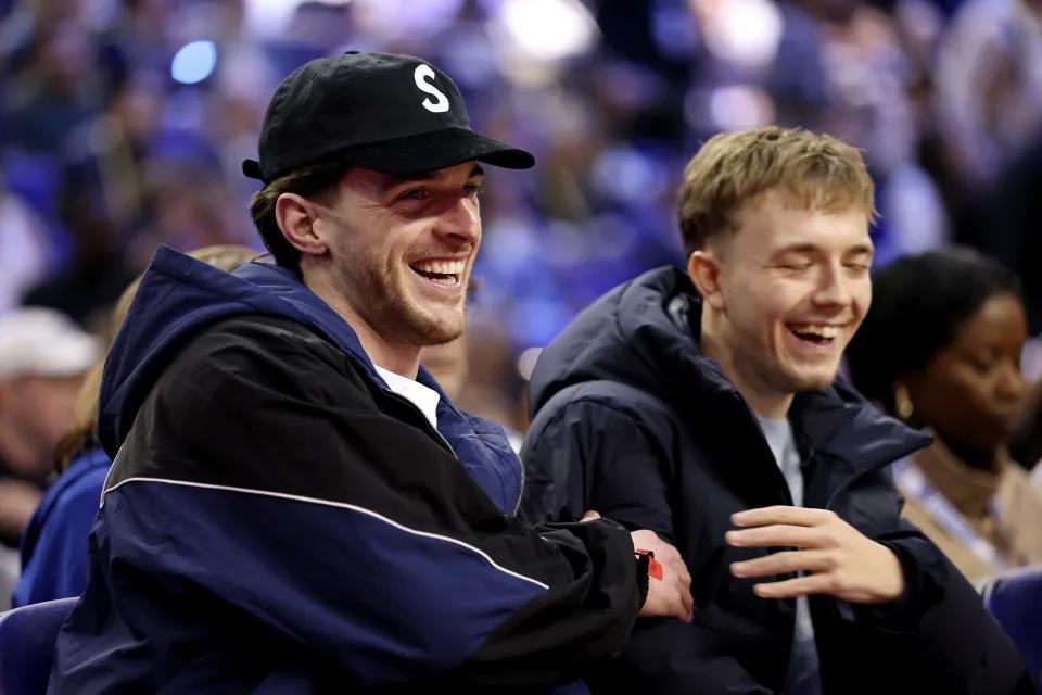 NBA倫敦賽當(dāng)日下午在倫敦O2體育館舉行,奧蘭多魔術(shù)對陣孟菲斯灰熊。剛在周六代表阿森納出戰(zhàn)的德克蘭-賴斯來到現(xiàn)場觀賽,坐在場邊貴賓席,視角極佳。