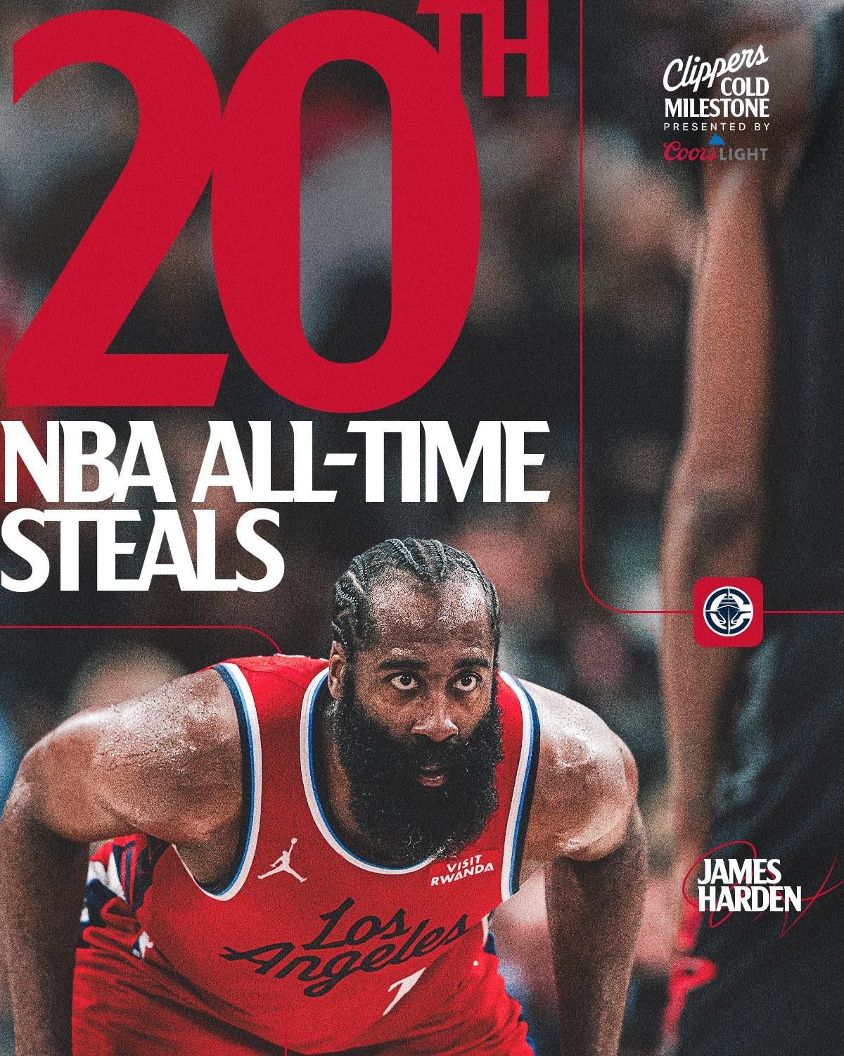 快船后衛(wèi)哈登上半場完成2次搶斷,至此,他在NBA歷史搶斷榜上超越伊戈達(dá)拉,排名歷史第20。