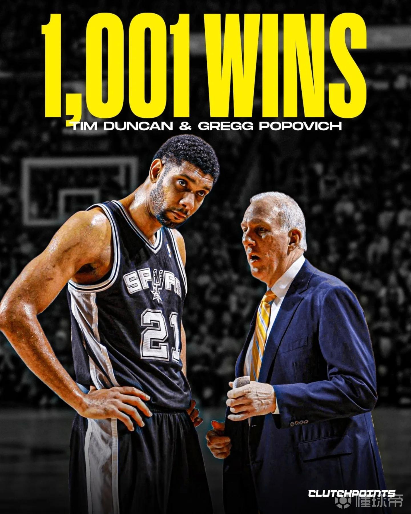 其中,鄧肯與波波維奇搭檔拿下1001場(chǎng)勝利,排名歷史第一,歷史前十中僅有兩隊(duì)搭檔是現(xiàn)役球員與現(xiàn)役主帥。
