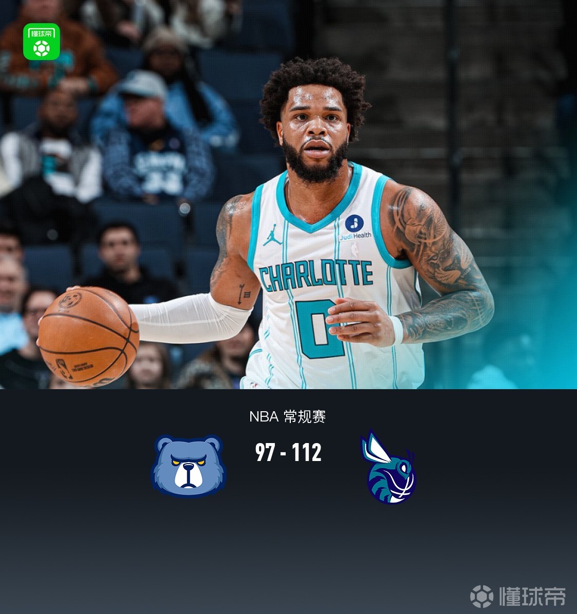 第四節(jié)灰熊文斯-威廉姆斯拿下4分,黃蜂迪亞巴特拿下12分,最終灰熊97-112不敵黃蜂