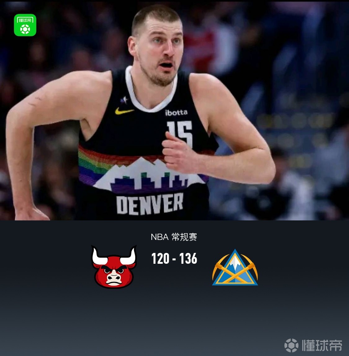 第四節(jié),開節(jié)4分鐘公牛持續(xù)啞火僅有2分入賬,掘金在約基奇組織串聯(lián)下一波20-2直接反超兩位數(shù),公牛理查茲、布澤利斯得分止血,掘金瓦蘭、穆雷聯(lián)手回應(yīng)領(lǐng)先至15分,比賽還剩4分鐘,穆雷傷退,公牛無力反撲,末節(jié)掘金轟出39-16,全場結(jié)束,公牛120-136不敵掘金。