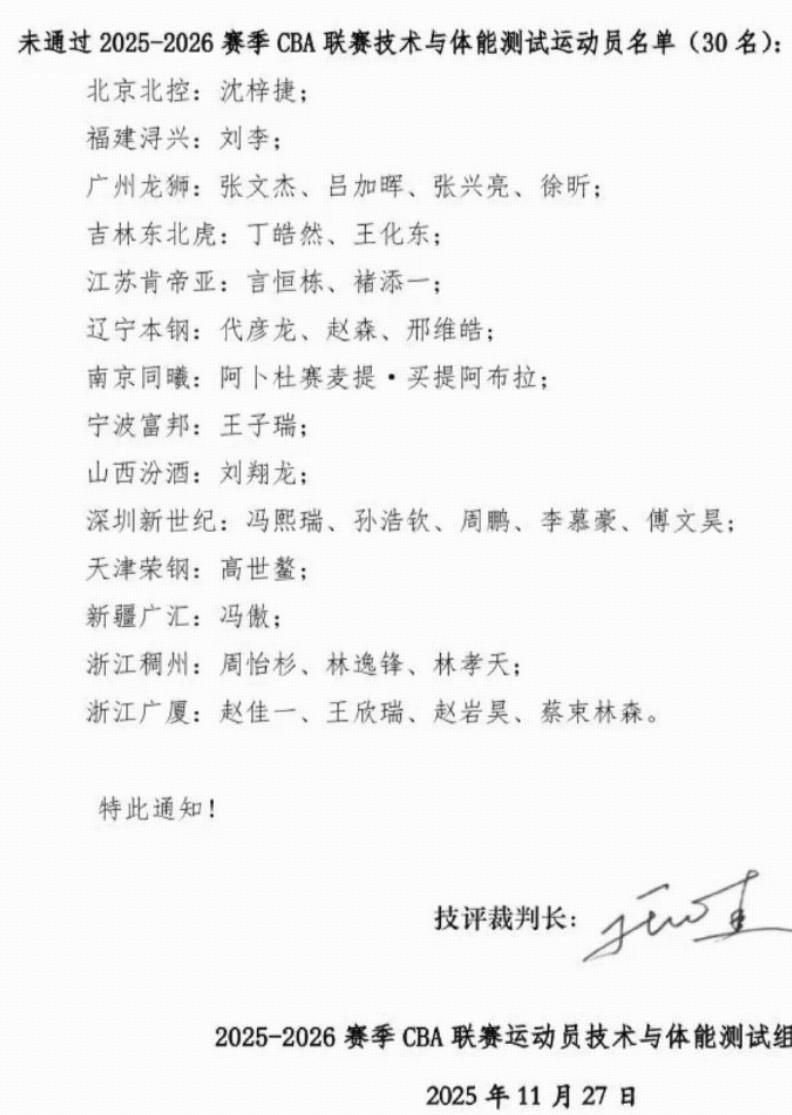 北京時(shí)間11月27日,CBA官方發(fā)布公告,本次CBA體測(cè)共有三十名運(yùn)動(dòng)員未通過,需要補(bǔ)測(cè)。