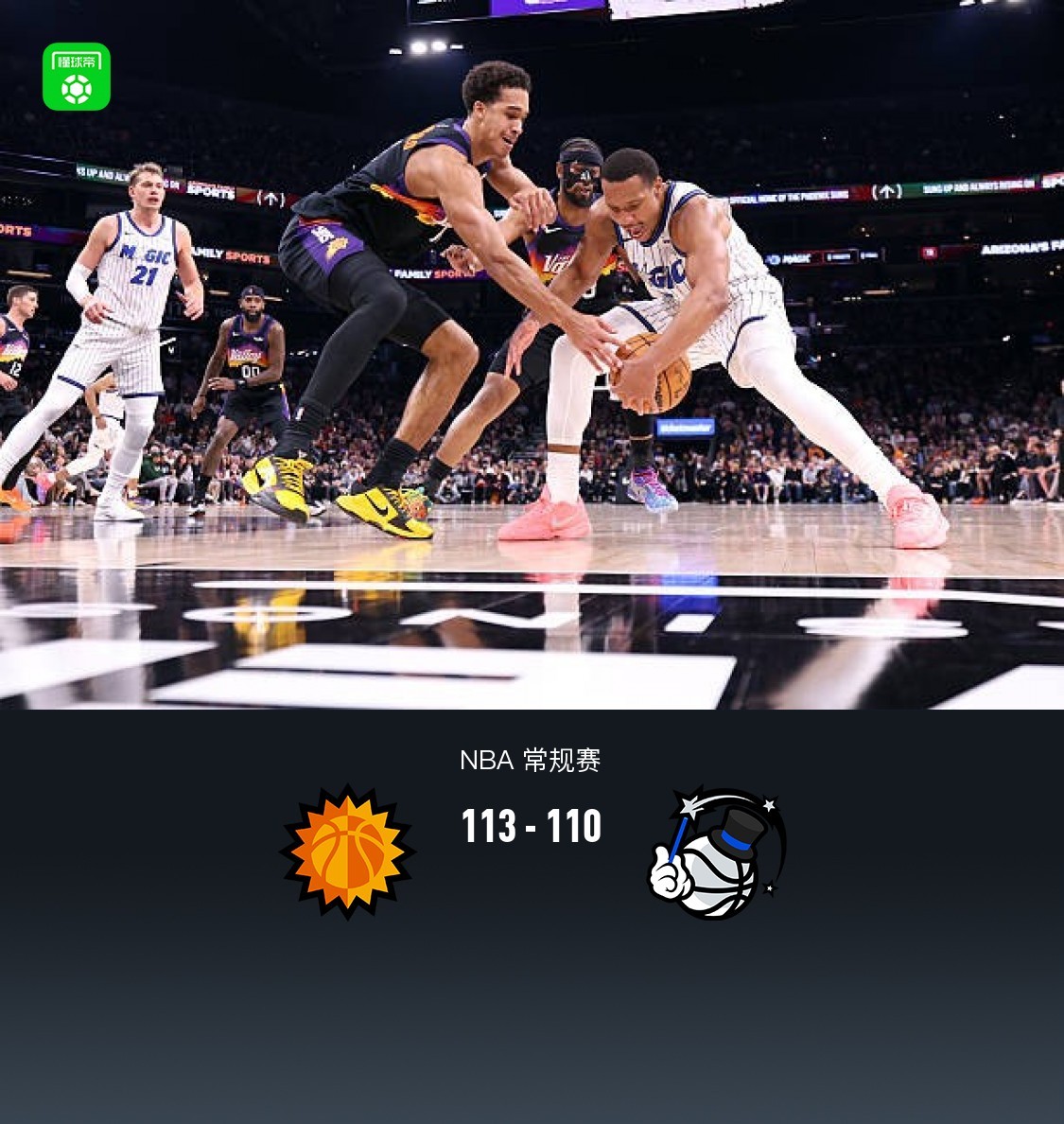 北京時間2月22日NBA 常規(guī)賽,菲尼克斯太陽對陣奧蘭多魔術(shù)。半場太陽43-51魔術(shù),最終,杰倫-格林壓哨三分絕殺,拒絕三加時,太陽113-110魔術(shù)。