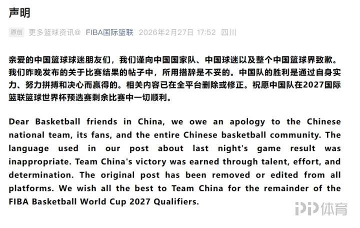 FIBA國際籃聯(lián)官方今日聲明,因昨日比賽結(jié)果帖子的措辭不當(dāng)而向中國男籃、中國球迷以及整個中國籃球界致歉。