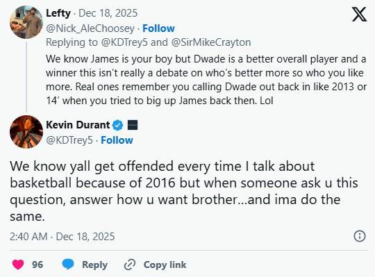 隨后還有一名網(wǎng)友說道:“我們知道詹姆斯(哈登)是你的哥們兒,但韋德是一位更全面的球員,也是一位真正的贏家。這其實(shí)不是在爭論誰更強(qiáng),而是你更喜歡誰的問題。真正了解你的人都記得你在2013年或2014年左右就曾批評(píng)過韋德,當(dāng)時(shí)你還試圖吹捧哈登。哈哈。”杜蘭特則回復(fù)道:“我知道每次我談到籃球你們都會(huì)生氣,因?yàn)?016年(加盟勇士)的事情,但當(dāng)有人問你這個(gè)問題時(shí),你想怎么回答就怎么回答,兄弟……我也會(huì)這么做。”