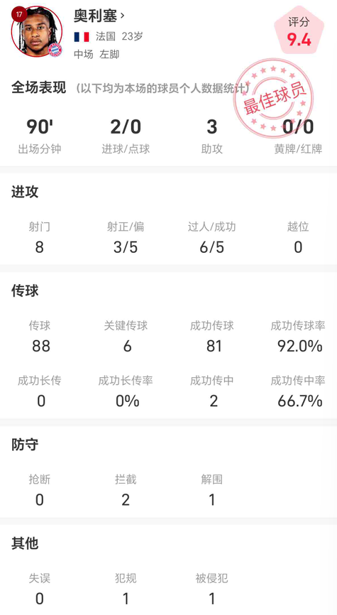 奧利塞vs弗賴堡全場(chǎng)數(shù)據(jù):打進(jìn)2球,助攻3次,攔截2次