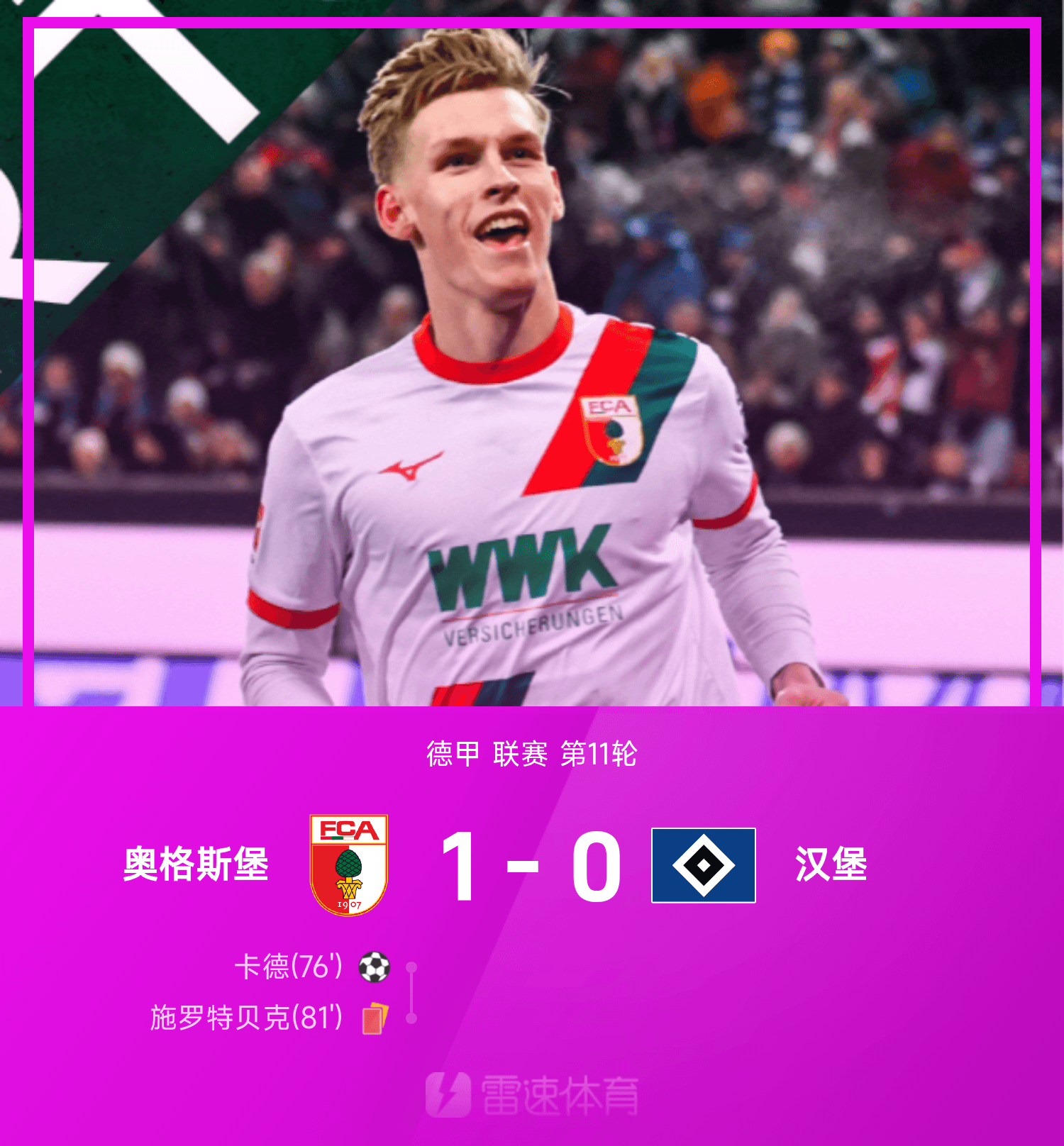 德甲戰(zhàn)報(bào):卡德打入唯一進(jìn)球,十人奧格斯堡1-0漢堡