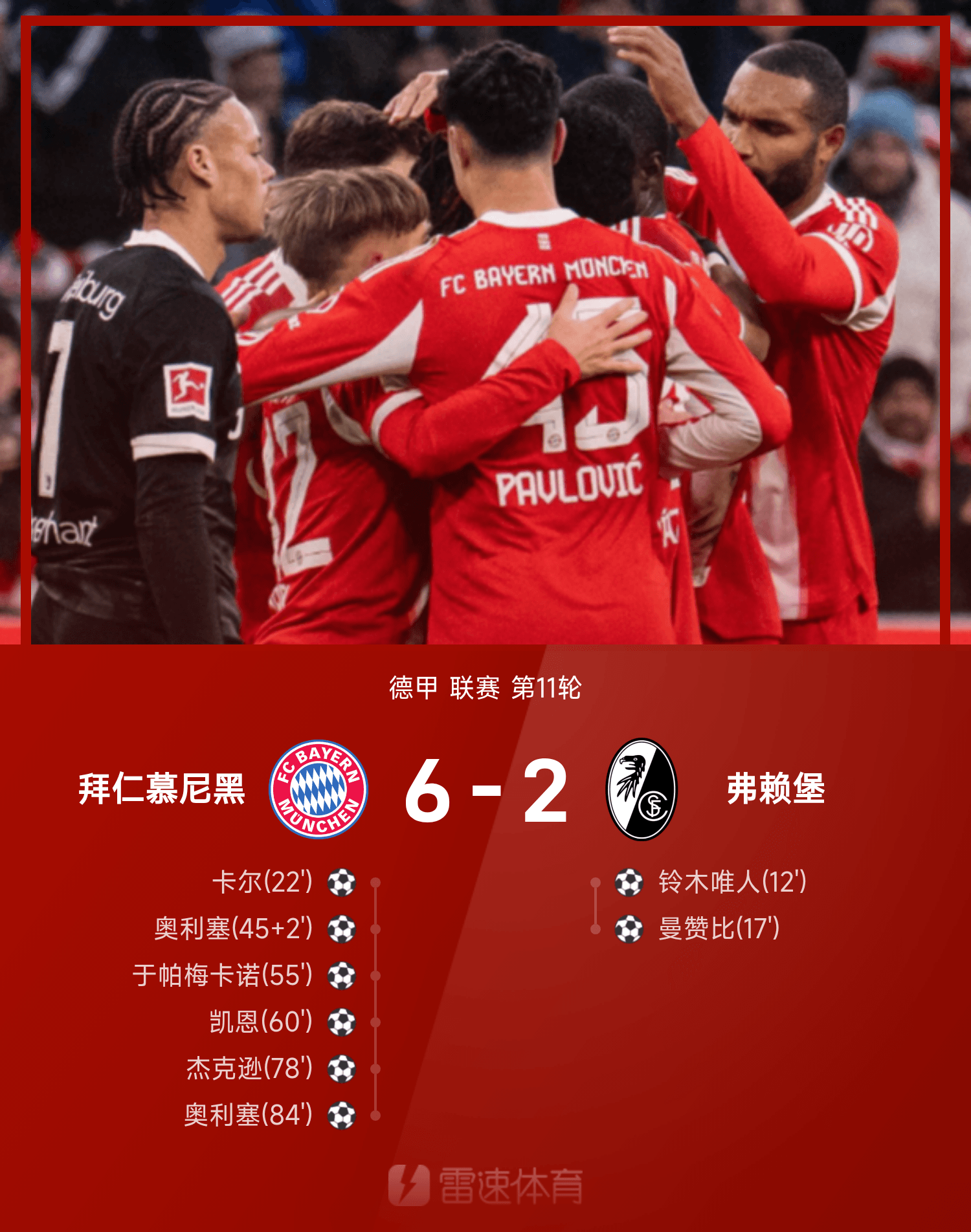 雷速體育11月23日訊 25/26賽季德甲聯(lián)賽第11輪,拜仁慕尼黑主場(chǎng)以6-2逆轉(zhuǎn)弗賴堡。