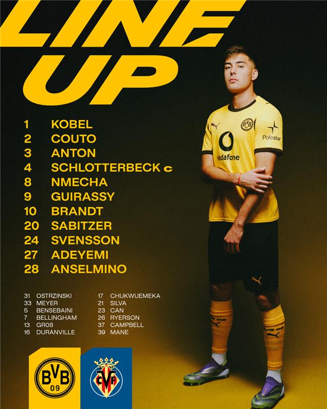 北京時(shí)間11月26日凌晨4:00,25/26賽季歐冠聯(lián)賽第5輪,多特蒙德主場(chǎng)迎戰(zhàn)比利亞雷亞爾,賽前首發(fā)公布。