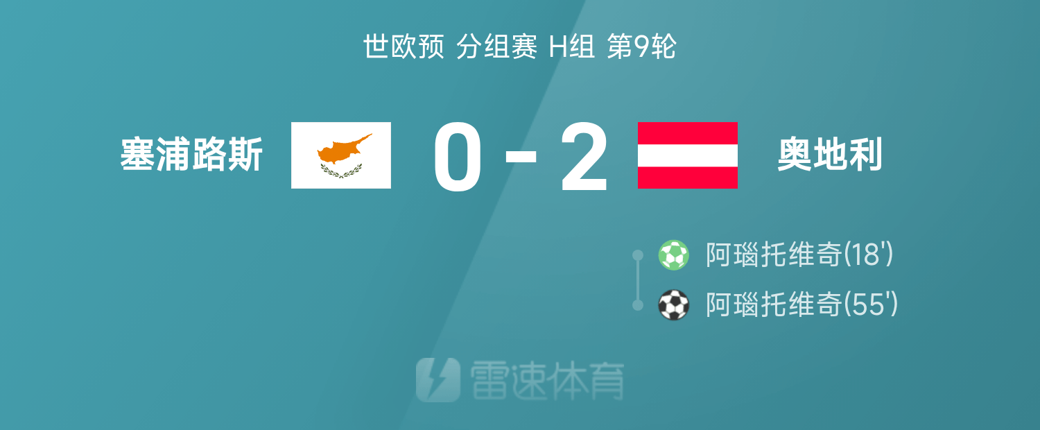 雷速體育11月16日訊 26賽季世歐預(yù)分組賽H組第9輪,奧地利2-0戰(zhàn)勝塞浦路斯。