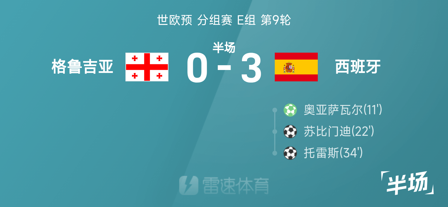 雷速體育11月16日訊 世歐預(yù)分組賽E組第9輪,西班牙客場4-0大勝格魯吉亞,基本上鎖定世界杯席位。