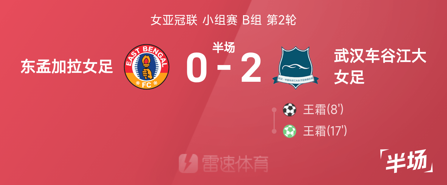 女亞冠聯(lián)半場:王霜梅開二度,武漢車谷江大2-0東孟加拉女足