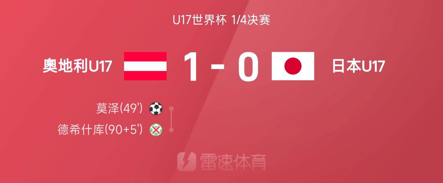 雷速體育11月21日訊 25賽季U17世界杯1/4決賽,奧地利U17隊(duì)1-0戰(zhàn)勝日本U17隊(duì)。