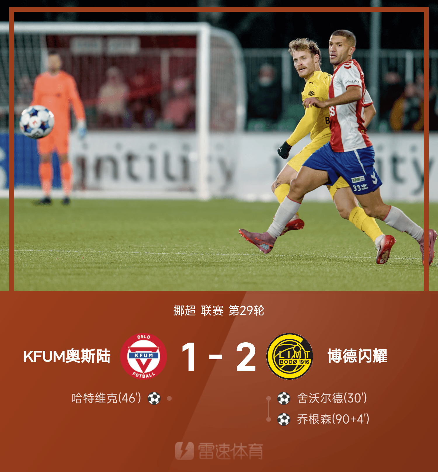 雷速體育11月22日訊 25賽季挪超聯(lián)賽第29輪,博德閃耀2-1戰(zhàn)勝KFUM奧斯陸,喬根森第90+4分鐘上演絕殺。