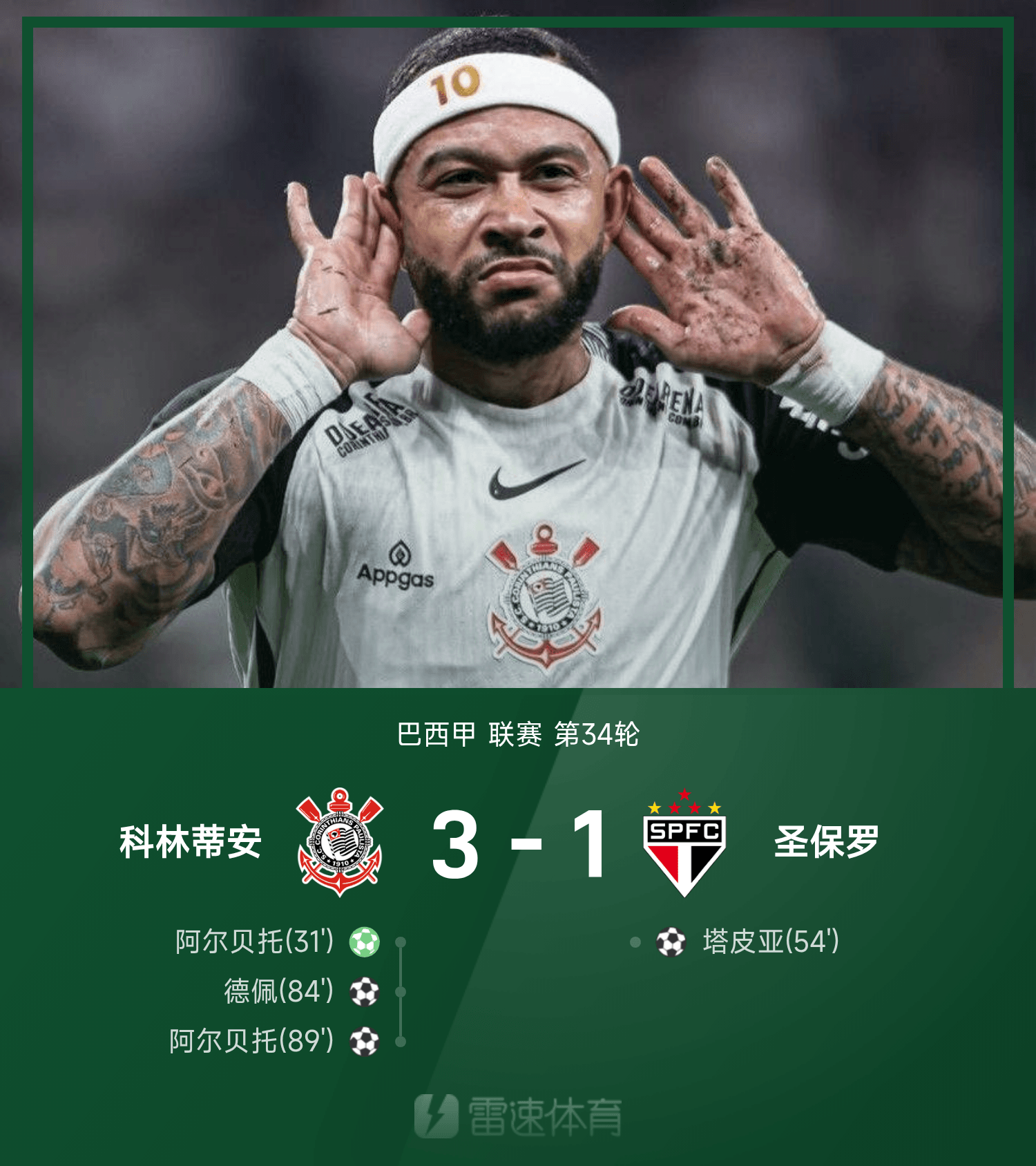 巴西甲戰(zhàn)報:阿爾貝托雙響,德佩建功,科林蒂安3-1圣保羅