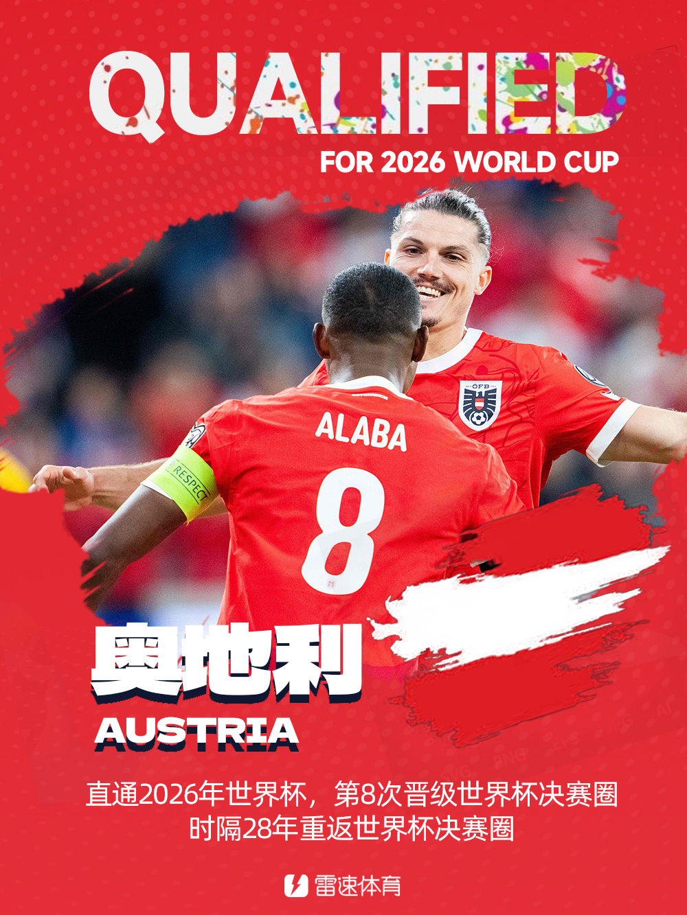 雷速體育11月19日訊 北京時間今日凌晨,奧地利在世歐預(yù)分組賽最后一輪主場戰(zhàn)平波黑,正式鎖定世界杯歐洲區(qū)H組頭名,隊史第8次躋身世界