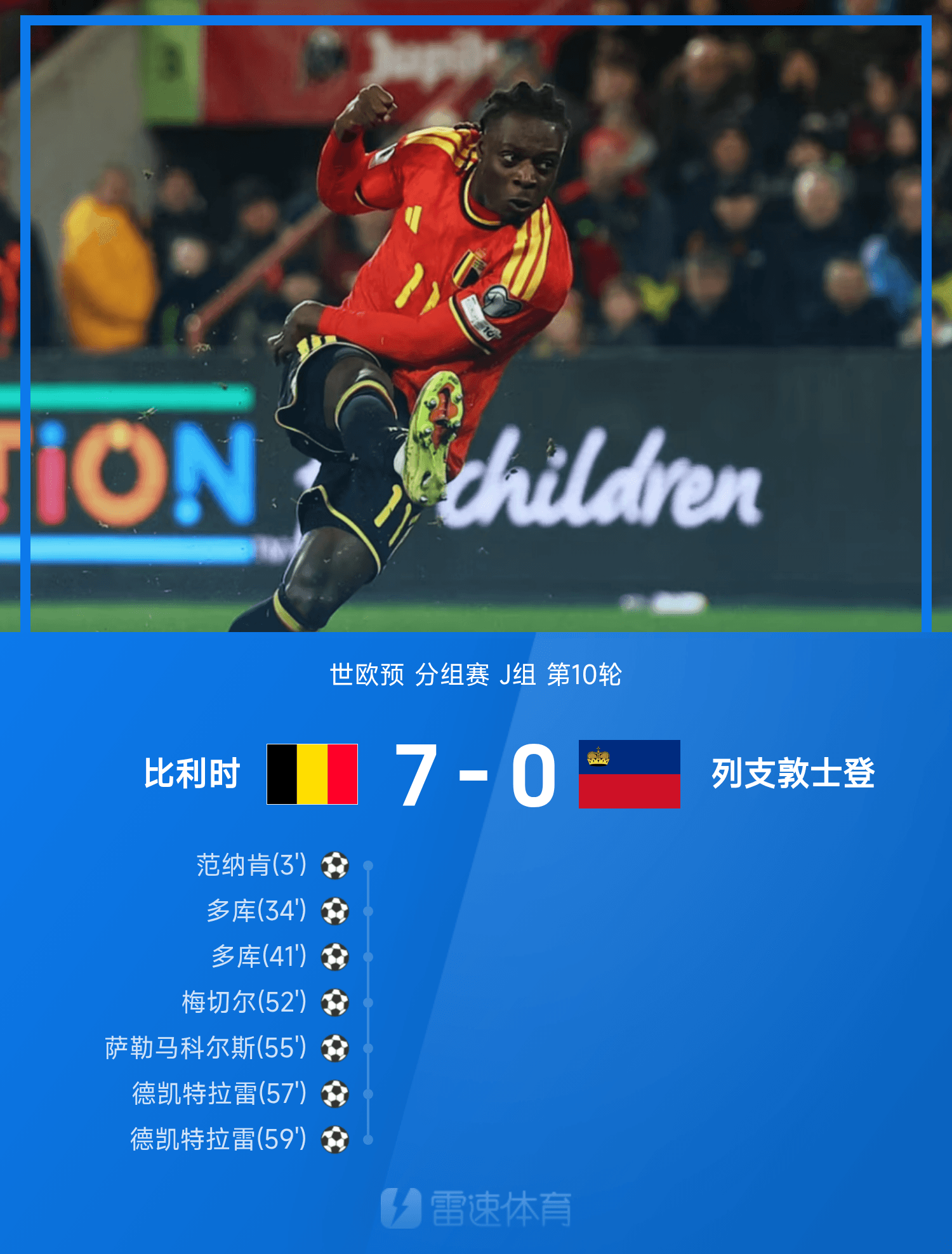 世歐預(yù)戰(zhàn)報:多庫雙響,比利時7-0列支敦士登,晉級世界杯