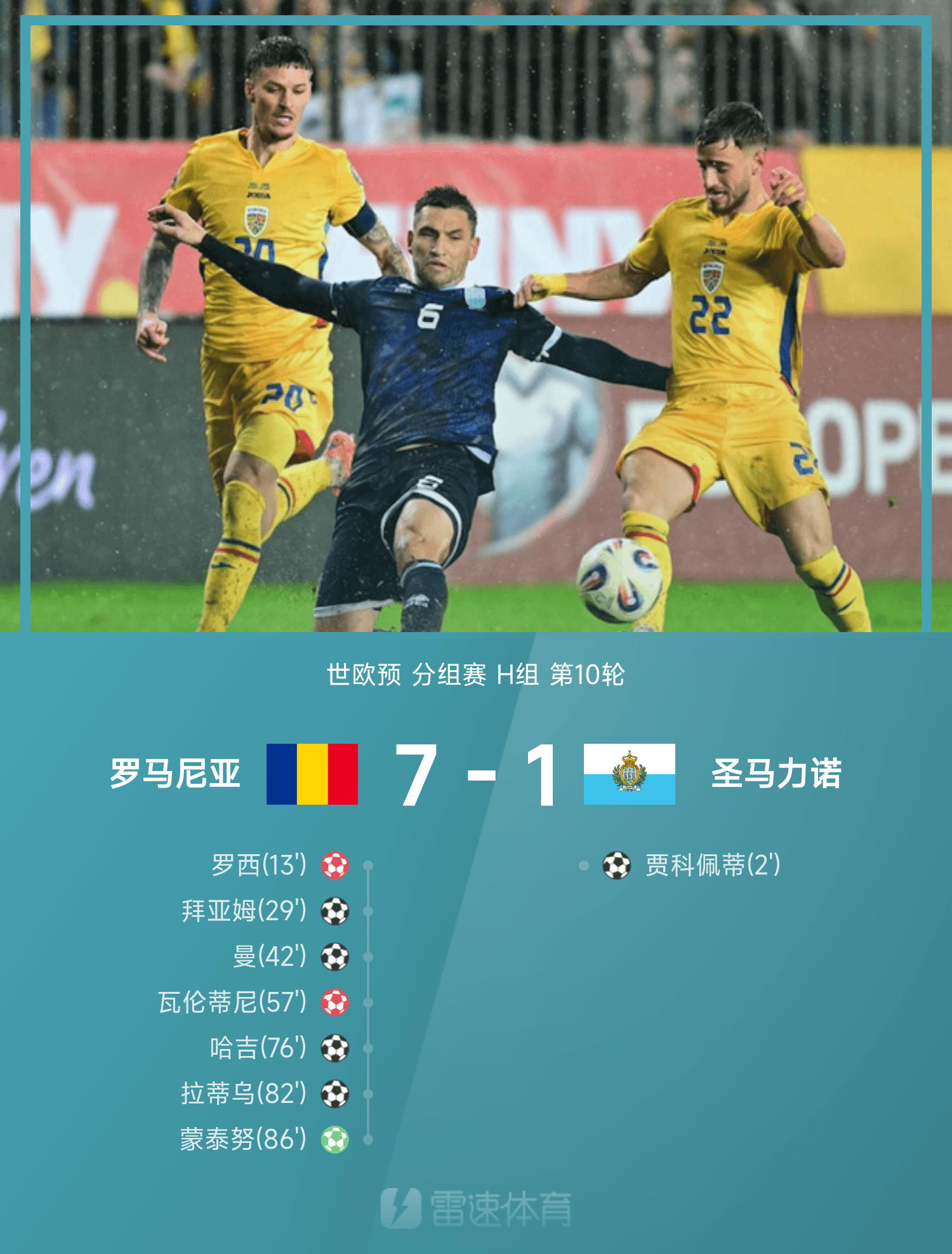 雷速體育11月19日訊 26賽季世歐預(yù)分組賽H組第10輪,羅馬尼亞7-1戰(zhàn)勝圣馬力諾。