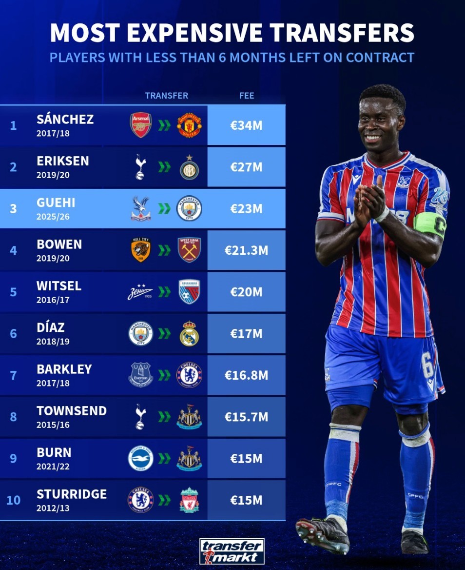 北京時(shí)間1月20日,在曼城官宣了格伊的交易之后,德轉(zhuǎn)列出了世界足壇歷史合同剩余不到半年的球員轉(zhuǎn)會(huì)身價(jià)