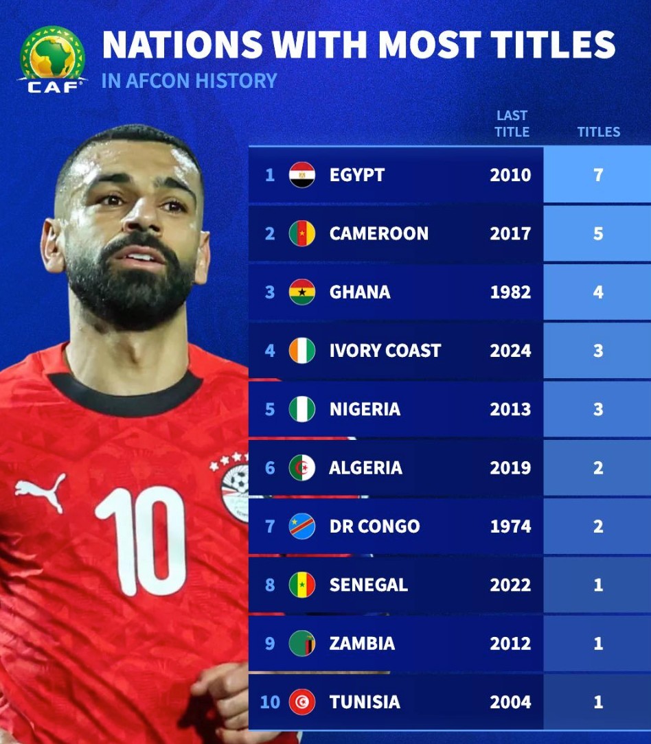 非洲杯奪冠與參賽次數(shù)排名:埃及7次奪冠26次參賽均位列第一
