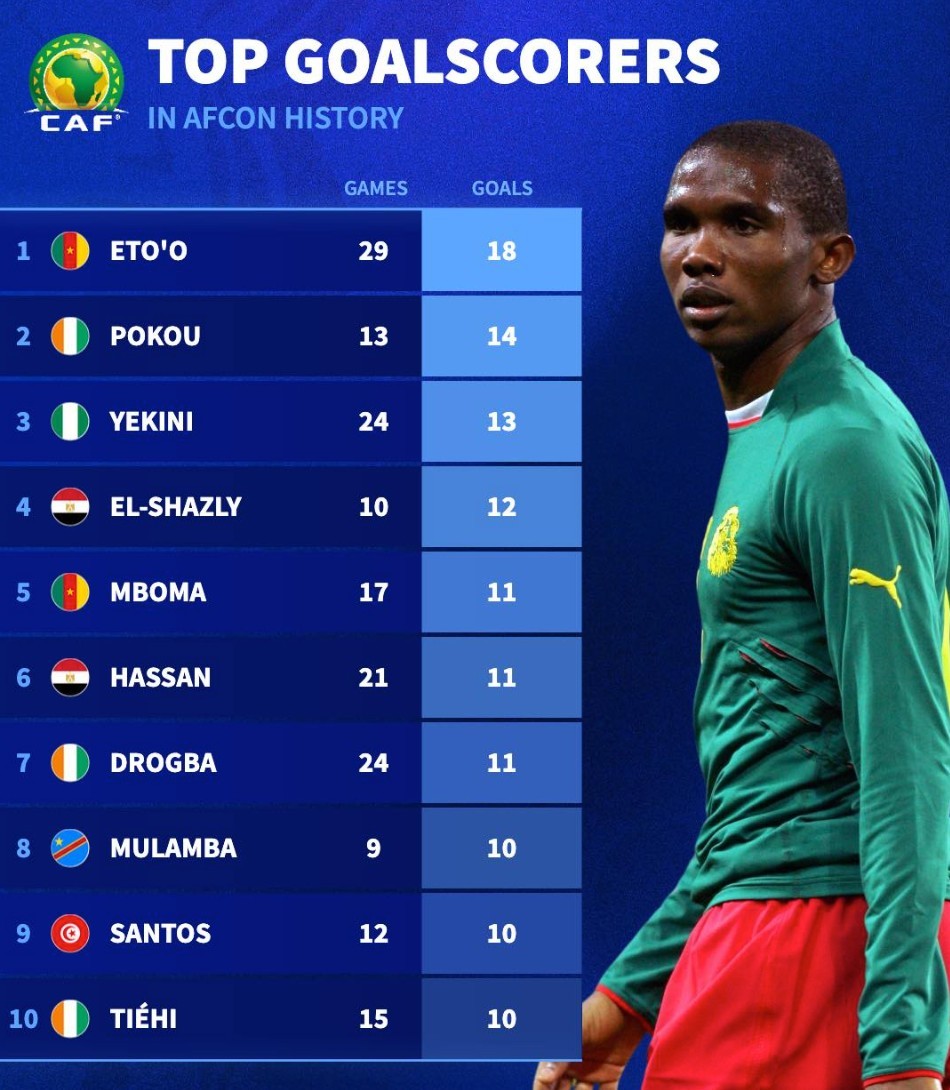 非洲杯歷史射手榜:埃托奧18球第1,德羅巴11球第7