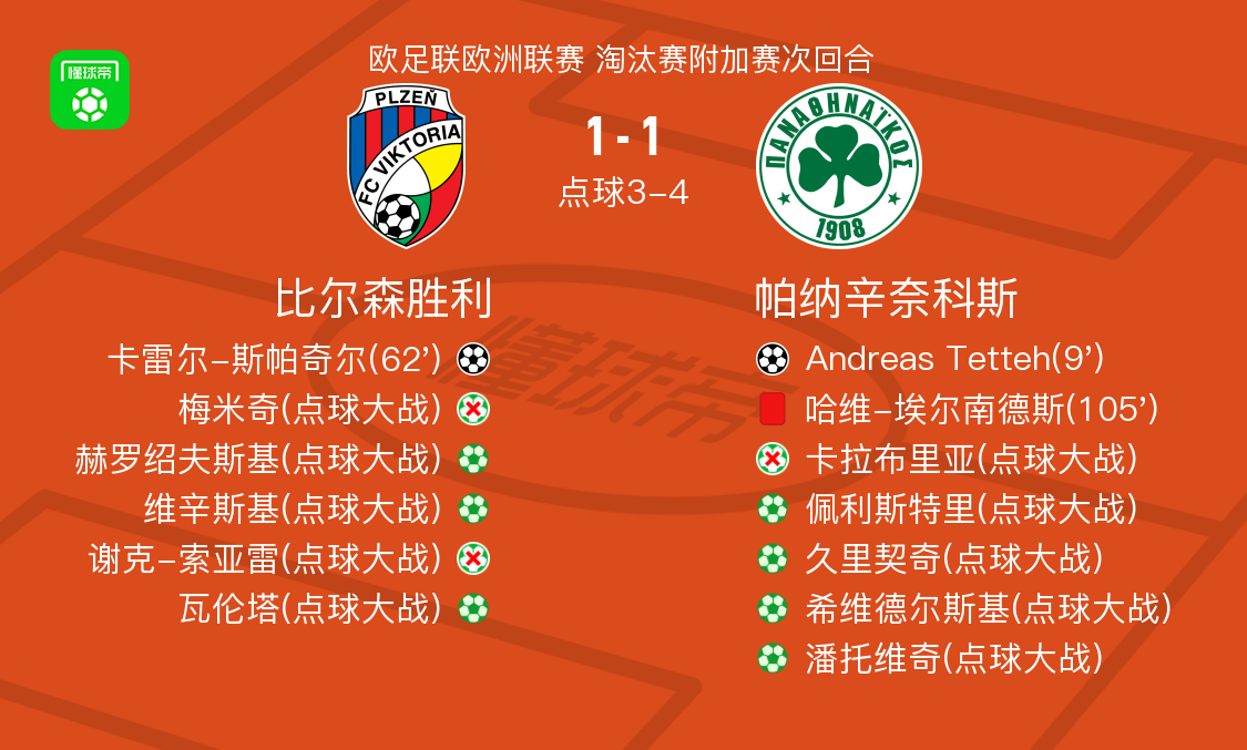 點球大戰(zhàn)帕納辛奈科斯5-4比爾森勝利,謝克-索亞雷失點