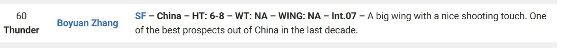 美媒:我們預測張博源將在27年NBA選秀次輪第60順位被選中