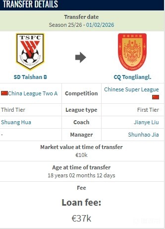德轉(zhuǎn):銅梁龍租借泰山后衛(wèi)岳瑞杰的租借費(fèi)約30萬(wàn)人民幣