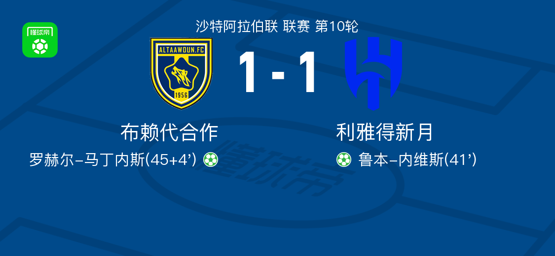 布賴代合作1-1利雅得新月,魯本-內(nèi)維斯先拔頭籌,羅赫爾-馬丁內(nèi)斯救主