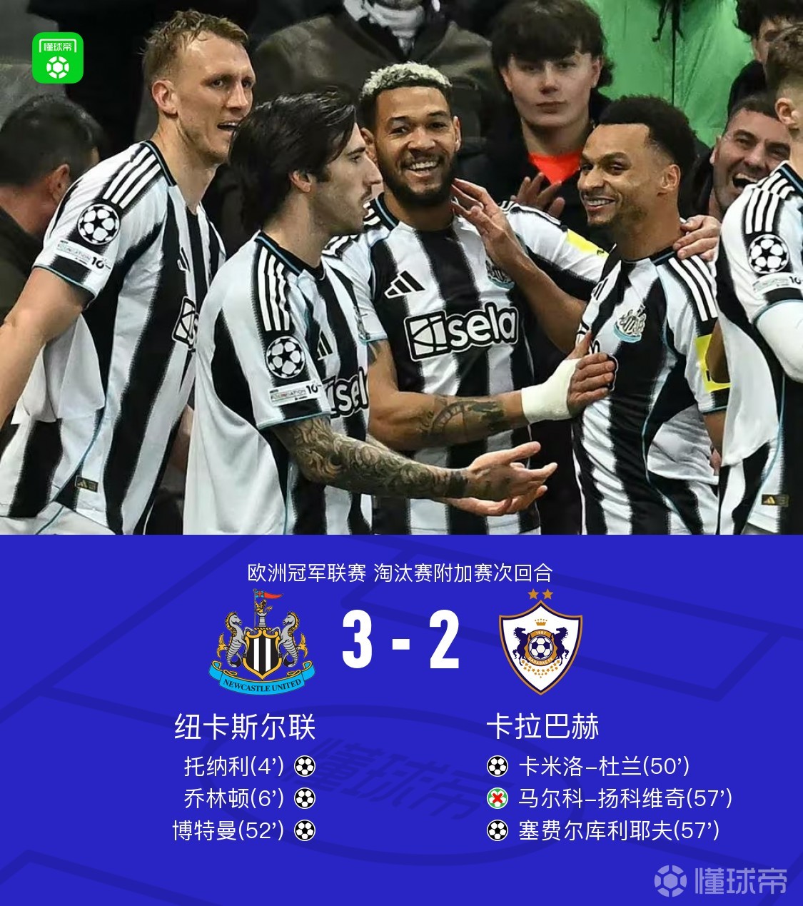 紐卡總比分9-3卡拉巴赫晉級歐冠16強(qiáng),托納利、喬林頓閃擊