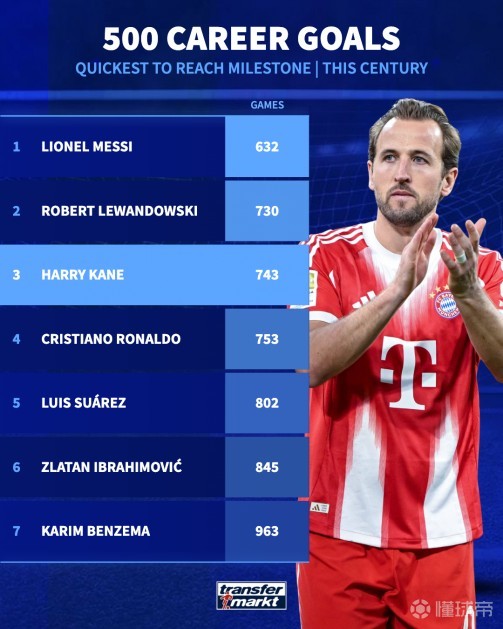 21世紀500球里程碑最快榜:凱恩第三,梅西萊萬一二,C羅第四