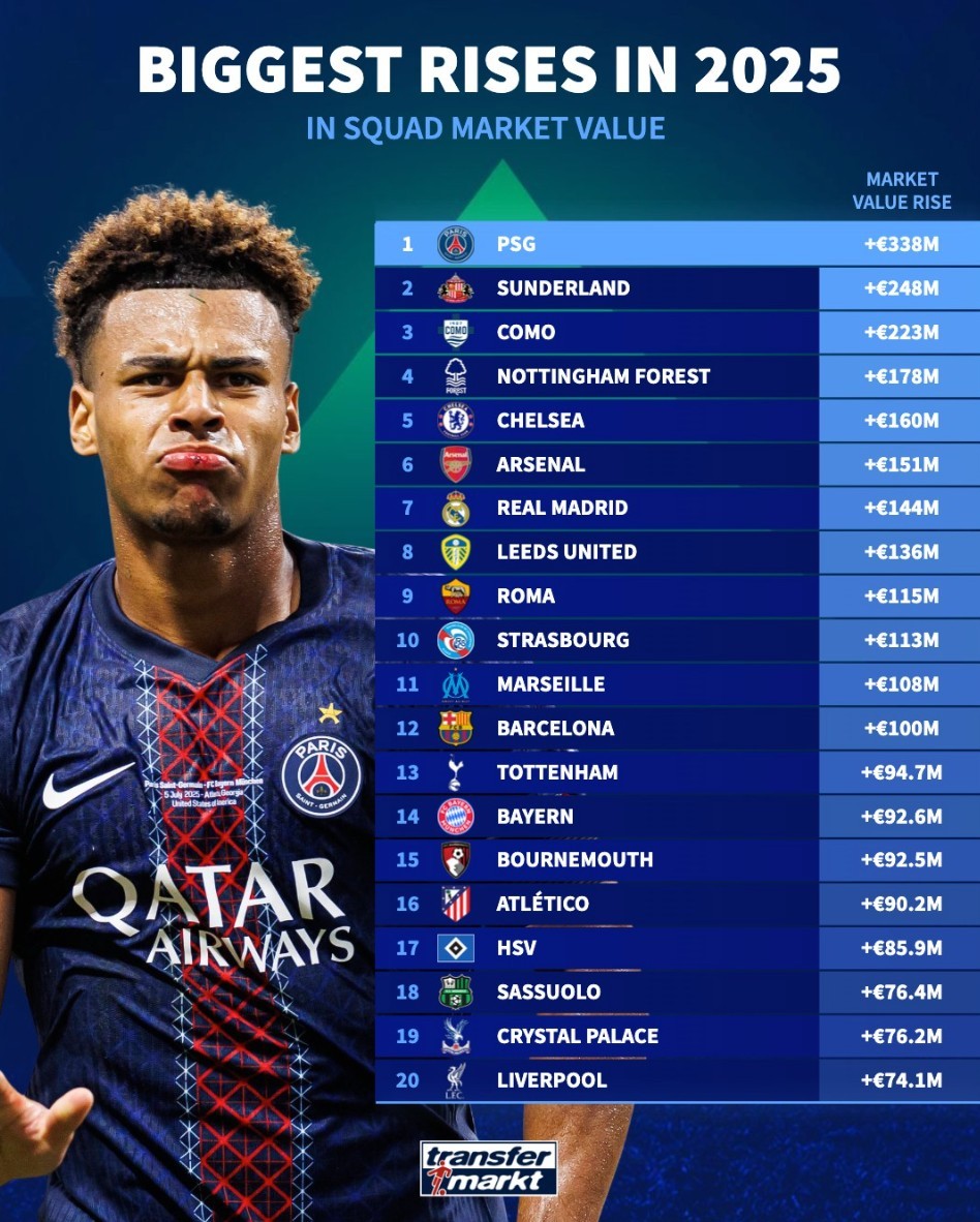 北京時間12月28日,德轉(zhuǎn)列出了2025年身價漲幅最高的20家俱樂部,巴黎圣日耳曼上漲3.38億歐元
