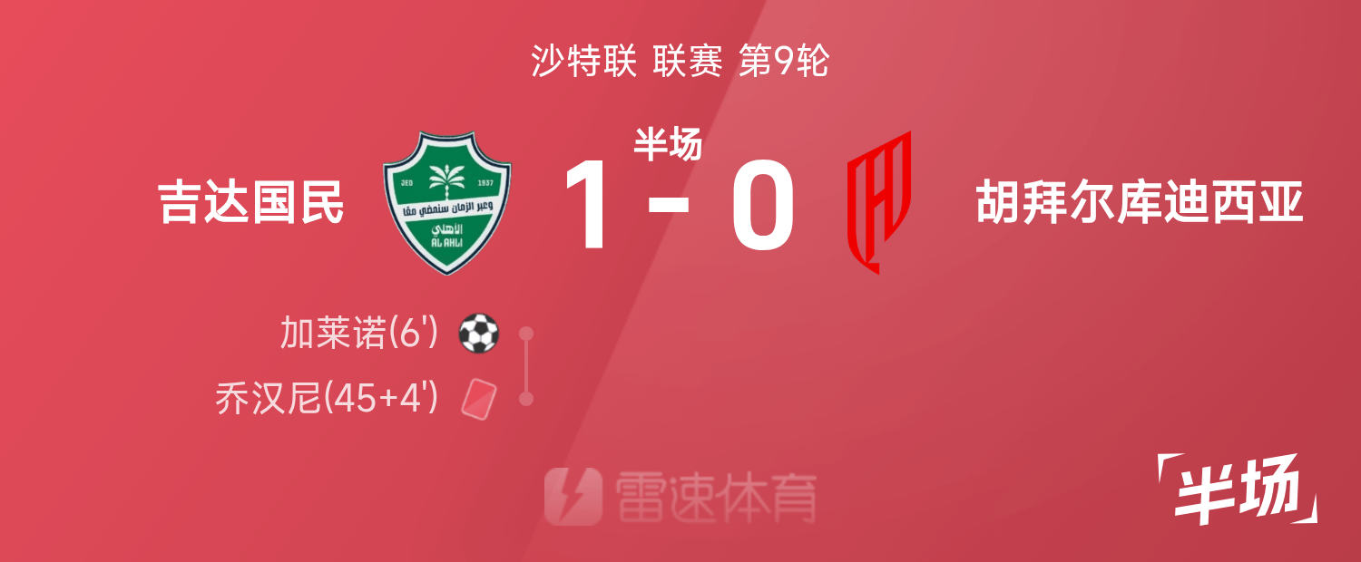 沙特聯(lián)半場(chǎng):加萊諾建功,吉達(dá)國(guó)民暫1-0胡拜爾庫(kù)迪西亞