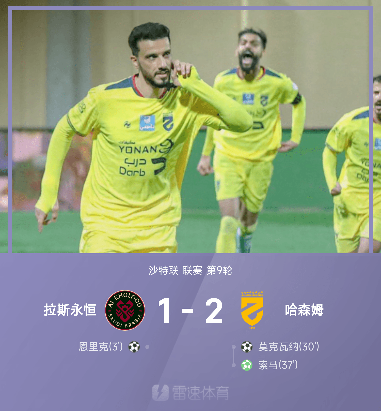 雷速體育11月22日訊 25/26賽季沙特聯(lián)聯(lián)賽第9輪,拉斯永恒坐鎮(zhèn)主場(chǎng)迎戰(zhàn)哈森姆。