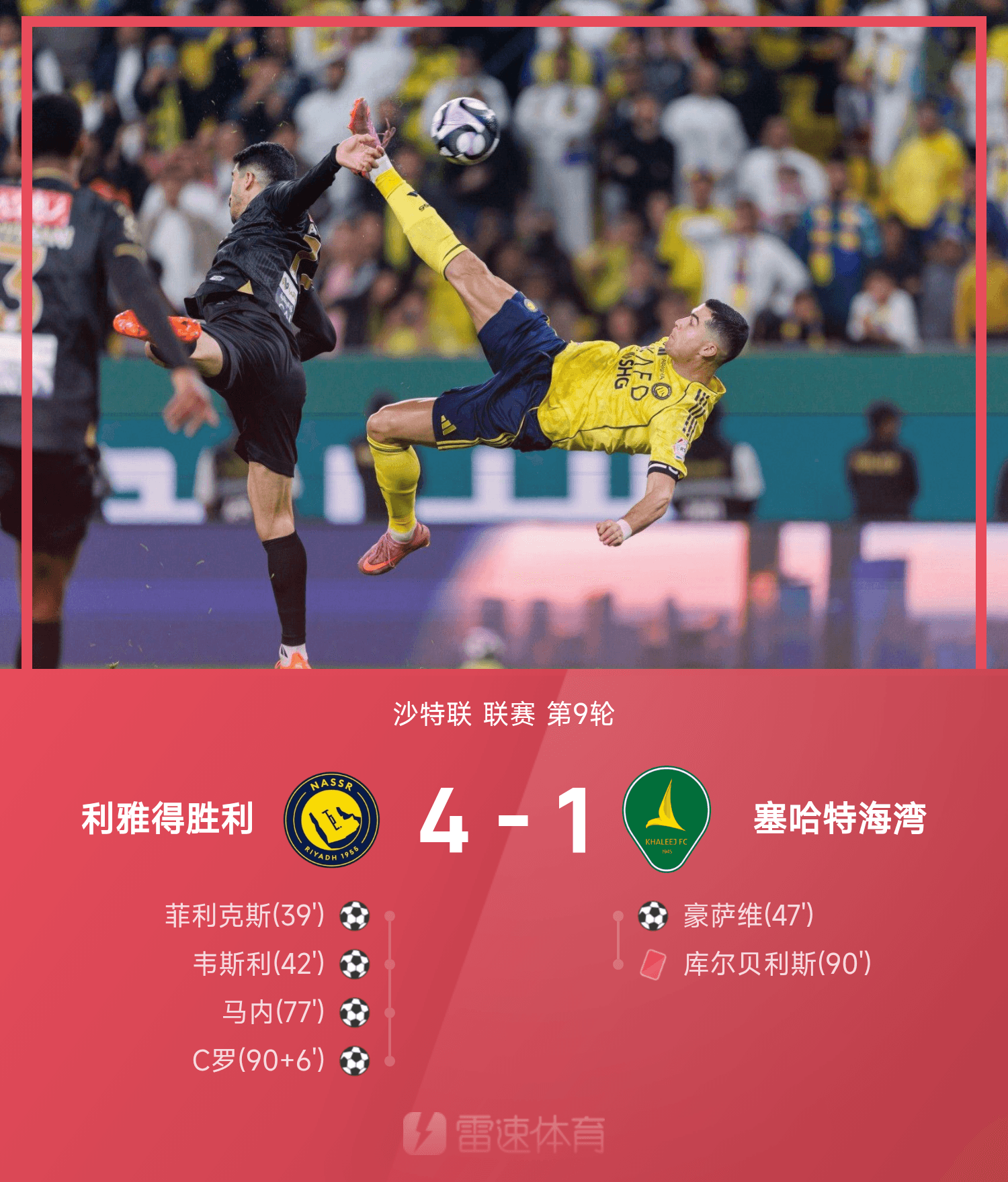 雷速體育11月24日訊 沙特聯(lián)第9輪,利雅得勝利主場(chǎng)以4-1大勝塞哈特海灣,C羅打入驚天倒鉤。