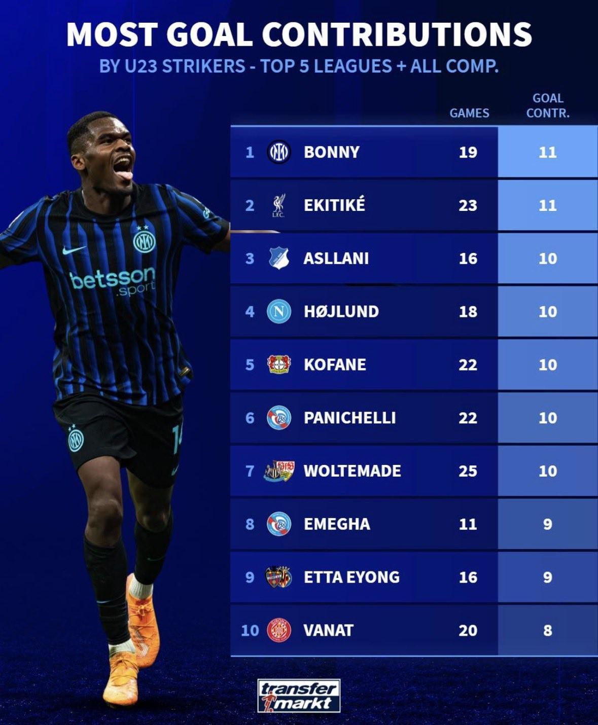 本賽季五大聯(lián)賽U23前鋒直接參與進(jìn)球前10:博尼、埃基蒂克第1