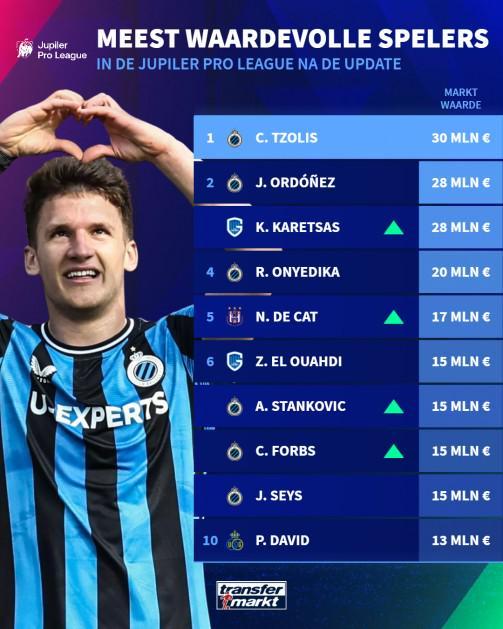 德轉(zhuǎn)比甲身價(jià)前10:措利斯3000萬(wàn)歐第1,小斯坦科維奇上榜