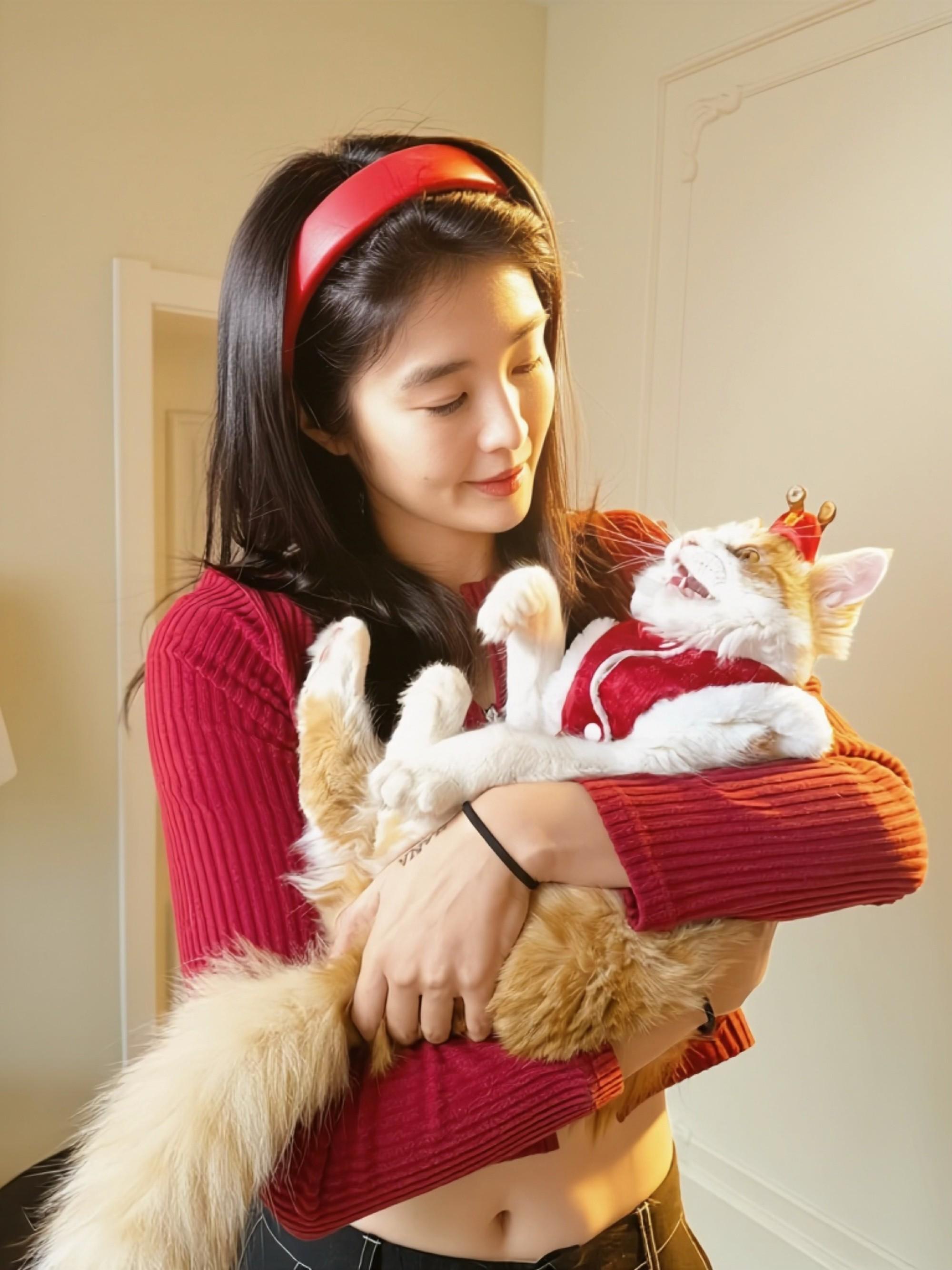 在照片中,趙麗娜穿著圣誕紅的毛衣,戴著紅色的發(fā)箍,懷里抱著小貓,也穿著紅色喜慶的衣服和帽子。