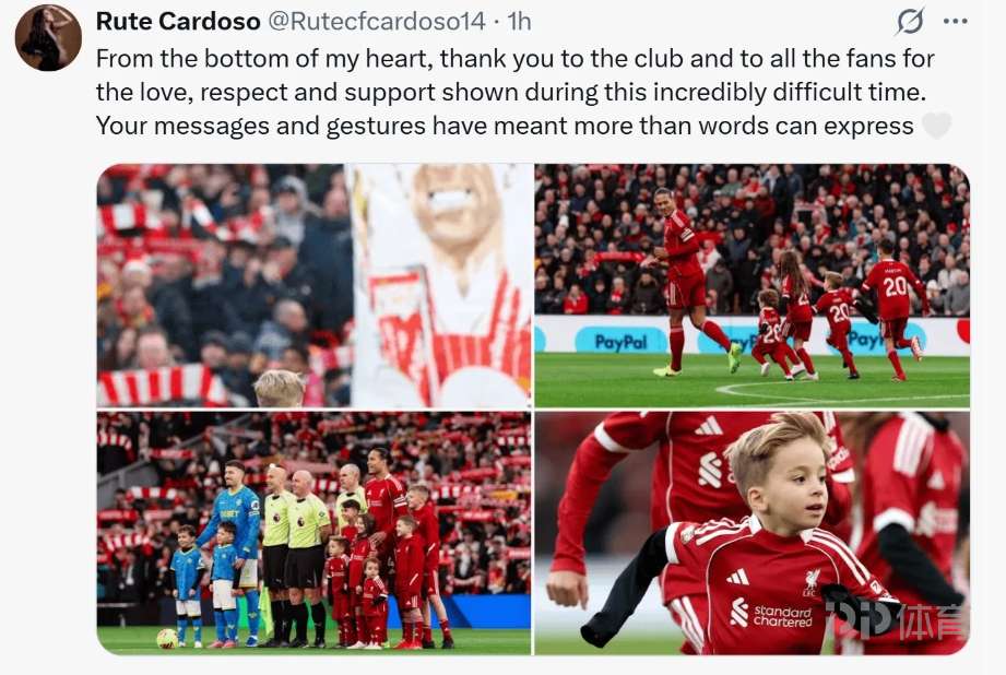 賽后,若塔的妻子Cardoso更新了社交媒體,發(fā)文向大家致謝。她的社媒配文這樣寫道:“謹以此心,感謝利物浦俱樂部以及所有球迷——在這段異常艱難的日子里,你們給予我的關(guān)愛、尊重與支持,我牢記于心。你們發(fā)來的每一條訊息、付出的每一份心意,都難以用言語形容其分量。”
