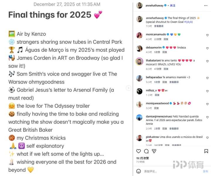 海瑟薇分享了一份自己在2025年剩余的待辦事項(xiàng),并且附文:“2025年的最終事項(xiàng)(特別鳴謝歐文·戈?duì)枺薄K纹さ貙wn goal(烏龍球)寫成了Owen Goal,意指阿森納近4場制造對(duì)手4記烏龍球。