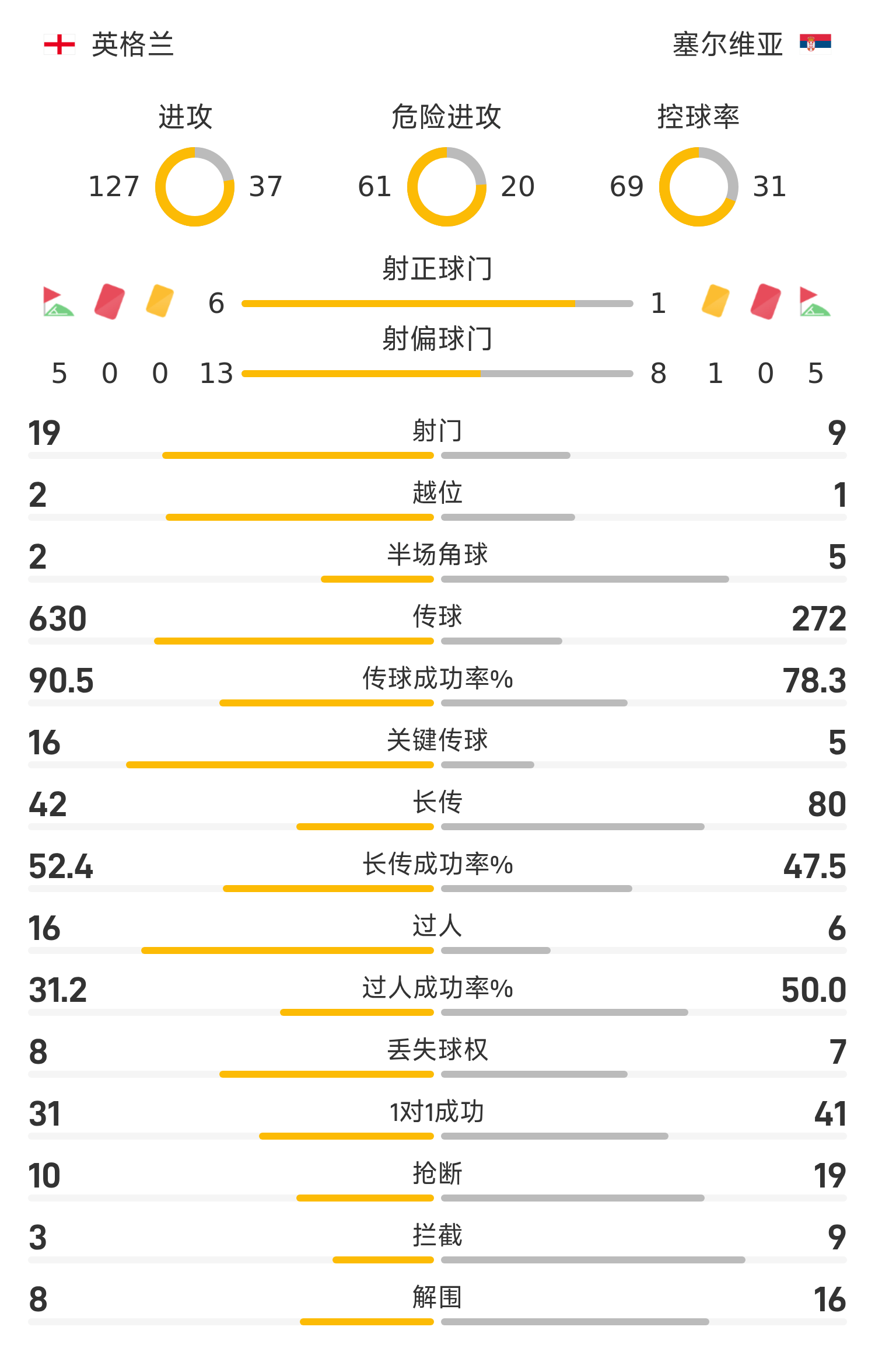 雷速體育11月14日訊 26賽季世歐預(yù)分組賽K組第9輪,英格蘭2-0戰(zhàn)勝塞爾維亞。全場比賽,薩卡凌空破門建功,埃澤最后時刻鎖定勝局,福登送助攻,伊里奇上半場傷退;英格蘭各項賽事豪取五連勝。