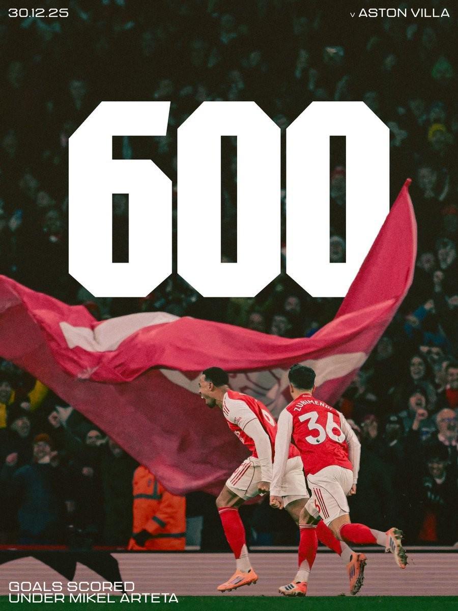 英超第19輪,阿森納主場對陣維拉,下半場加布里埃爾破門為阿森納取得領(lǐng)先,據(jù)統(tǒng)計,這是阿爾特塔治下阿森納打入的第600球。