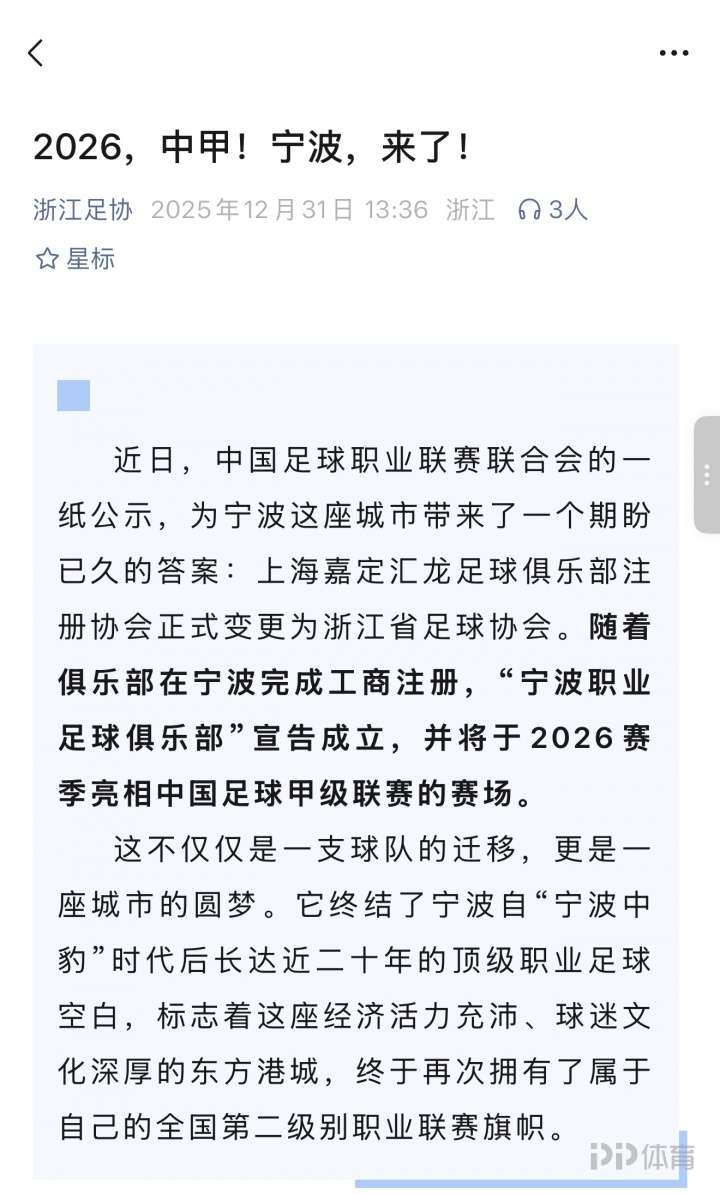 浙江足協(xié)官方宣布,隨著俱樂部在寧波完成工商注冊,“寧波職業(yè)足球俱樂部”宣告成立,并將于2026賽季亮相中國足球甲級聯(lián)賽的賽場。