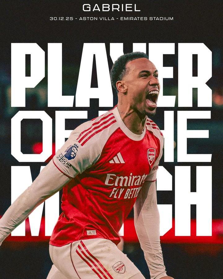 在今天凌晨進行的英超第19輪比賽中,阿森納主場4-1擊敗阿斯頓維拉,賽后,加布里埃爾被阿森納評為本場比賽隊內最佳球員。