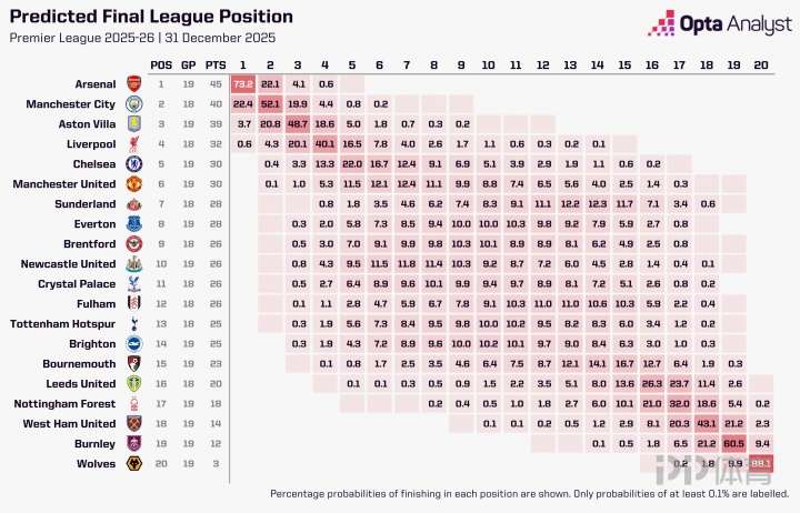 OPTA列本賽季英超奪冠概率:阿森納73% 利物浦0.6%