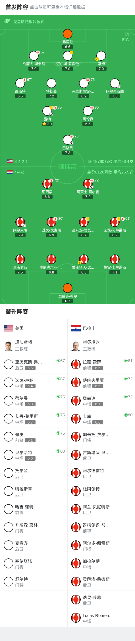 國際友誼賽,美國對(duì)陣巴拉圭。比賽開局階段,阿爾夫斯滕送出助攻,雷納完成破門,為美國取得領(lǐng)先。隨后,阿爾米隆助攻阿萊士-阿爾塞攻入一球,幫助巴拉圭扳平比分。進(jìn)入下半場,巴洛貢突破得分,助力美國再度占據(jù)優(yōu)勢(shì)。最終全場結(jié)束,美國以2比1戰(zhàn)勝巴拉圭。