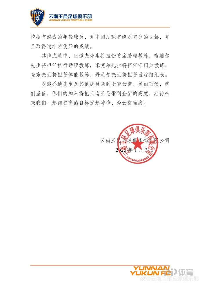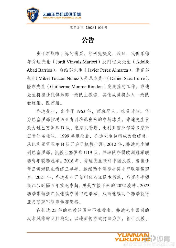 官方消息,前浙江主帥喬迪執(zhí)教云南玉昆。